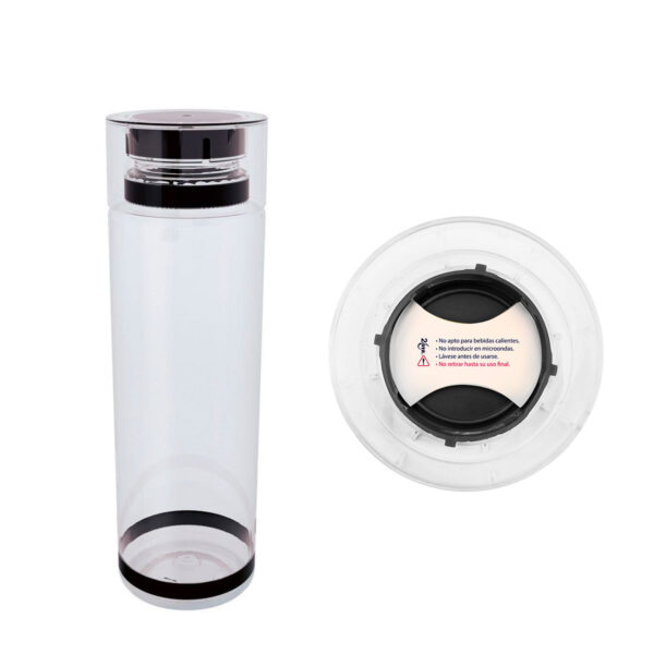 Sistema de rosca twist-off que permite abrir y cerrar la tapa en un giro. Cuenta con dos bandas elásticas de silicón, una en el cuello y otra en la base del cilindro. Mantener el linner en el interior de la tapa en todo momento, se debe retirar hasta su uso final. No exponer el cilindro a temperaturas mayores a 40 °C y revisar que la tapa no esté cerrada completamente para su almacenamiento y transportación. No apto para bebidas calientes. No introducir en microondas ni lavavajillas.