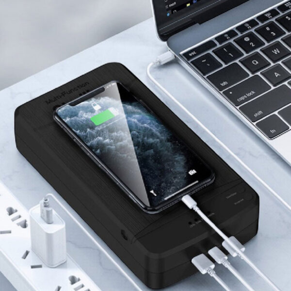 Esterilizador 360° para teléfonos de hasta 6.5” con luz UV y UVC LED (desinfectante de ozono) para potenciar el efecto de esterilización. Esteriliza en 3 minutos productos como tapabocas, relojes, audífonos, llaves, artículos electrónicos, etc. Función de difusor de aromas (una o dos gotas de aceites esenciales). Capacidad interna: 18 x 10.4 x 3.6 cm. Doble entrada USB y entrada tipo C. Funciona siempre conectado a una fuente de corriente.