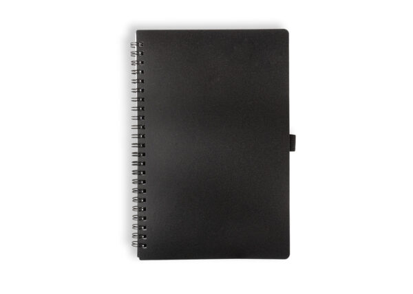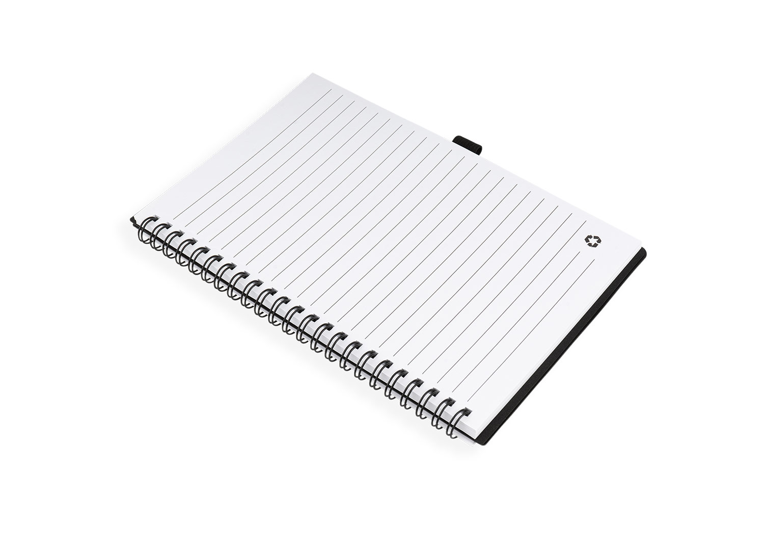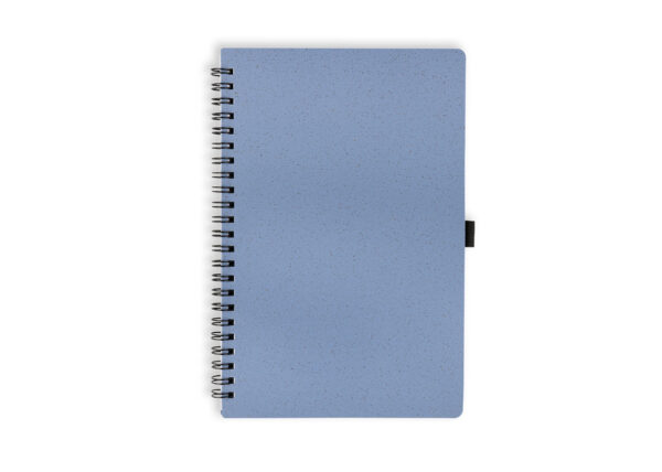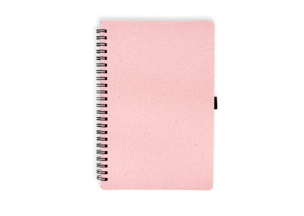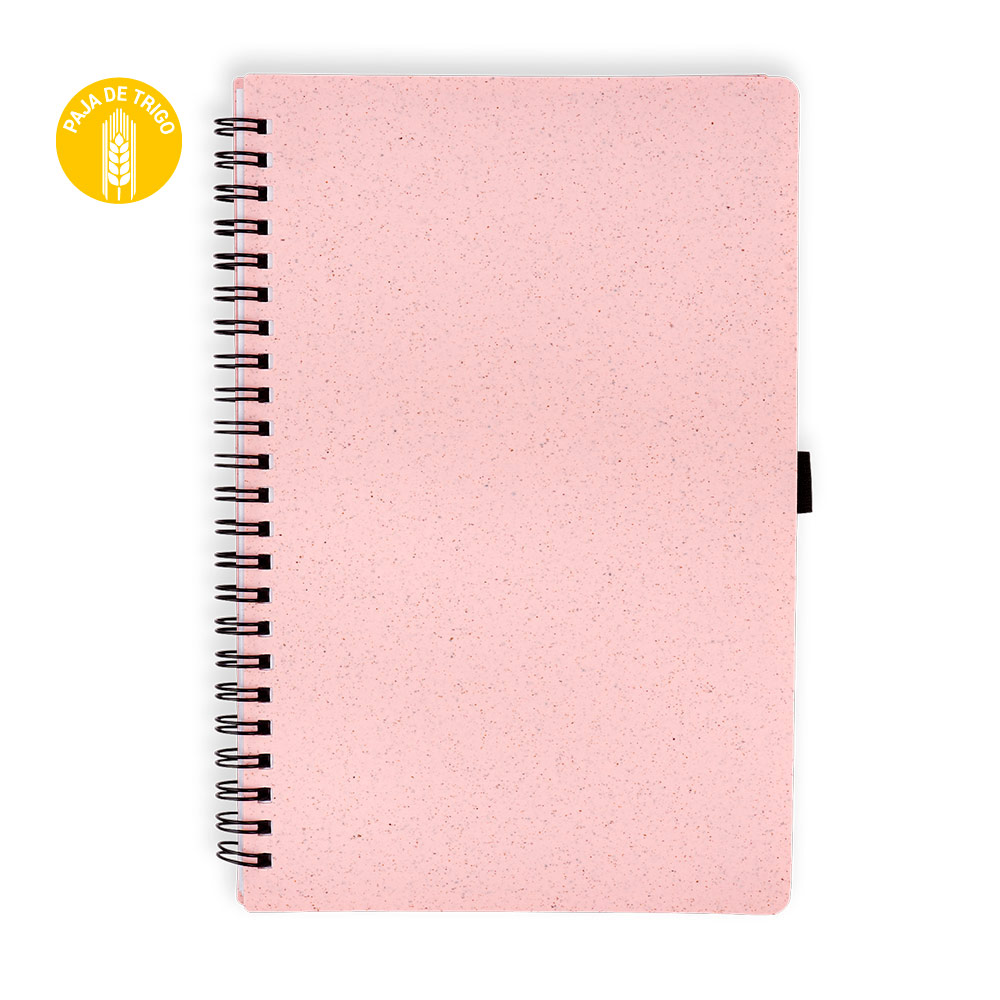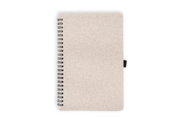 Libreta argollada ‘doble O’ con cubierta en paja de trigo. Contiene 70 hojas rayadas de papel reciclado. Tamaño aproximado de la hoja: A5.