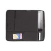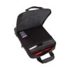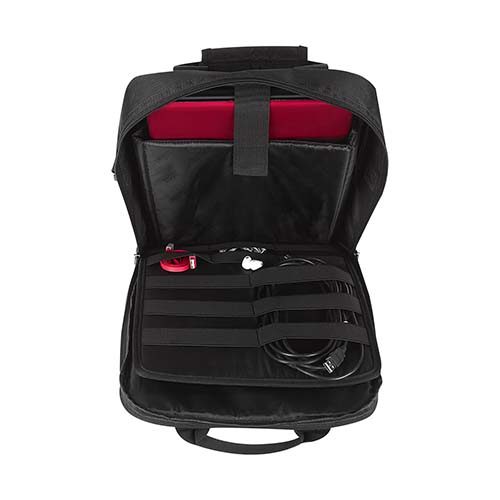 Mochila-portafolio. Bolsa principal con espacio para laptop de 15″ y organizador removible para cables, tablet, smartphone y tarjetas. 2 Bolsas frontales, una con cierre en forro para facilitar bordado. Parte trasera con cierre para esconder tirantes removibles. Incluye asas y correa ajustable para hombro.
