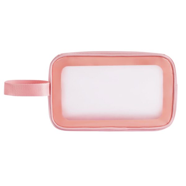 Práctico neceser de viaje impermeable. Ayuda a mantener organizados los accesorios o cosméticos gracias a su compartimento principal con cierre. Hecho de material PVC, el cual protege sus pertenencias de derrames, polvo o rasguños. Incluye asa lateral para su fácil trasportación.