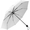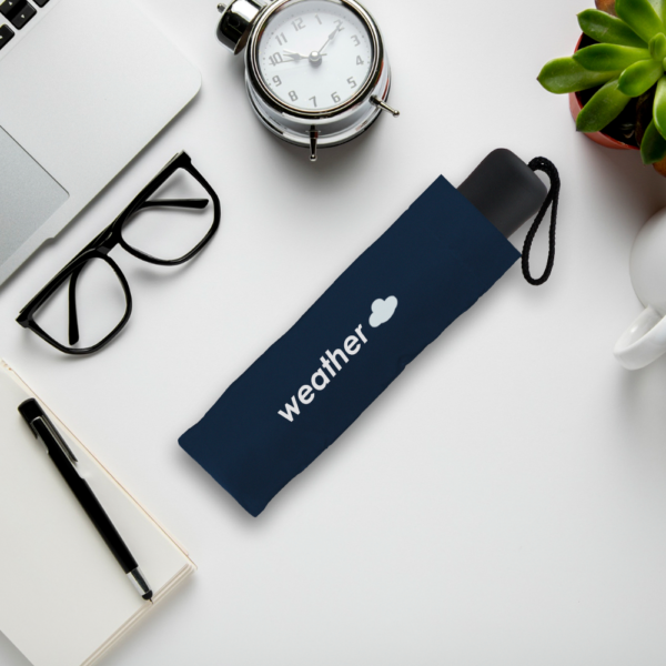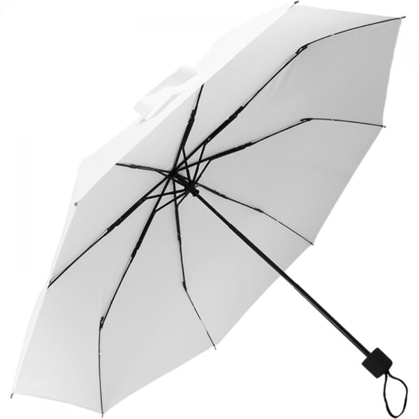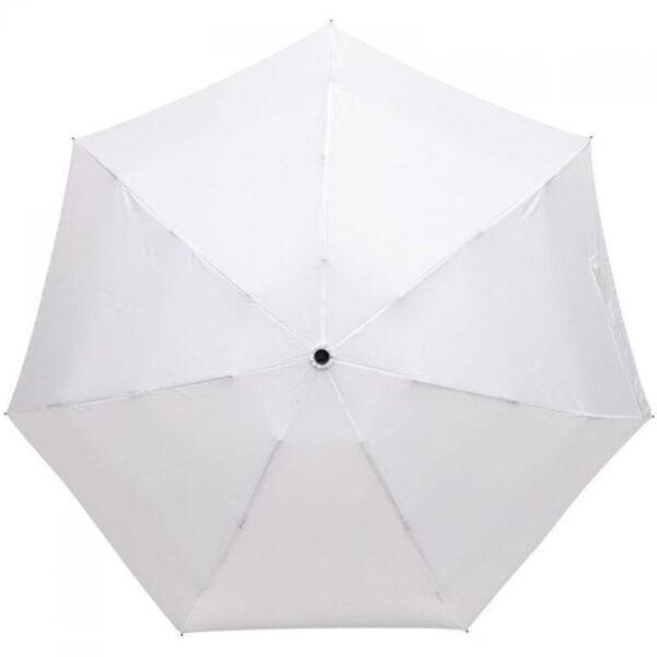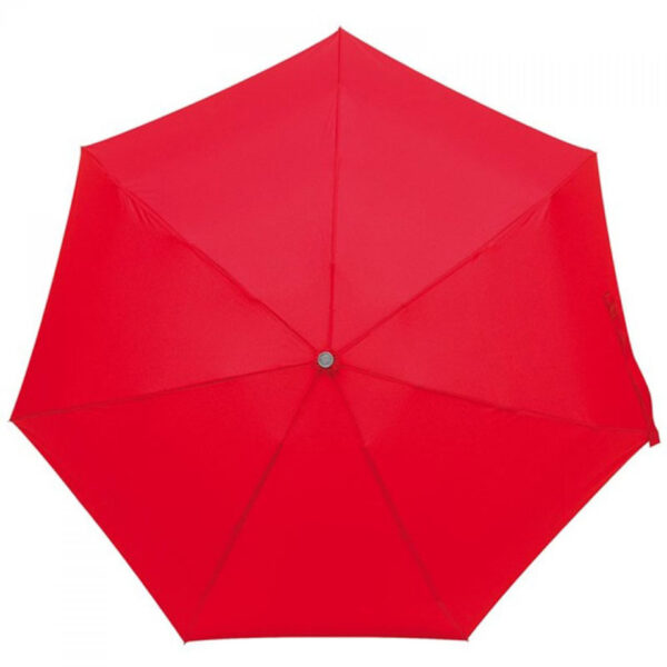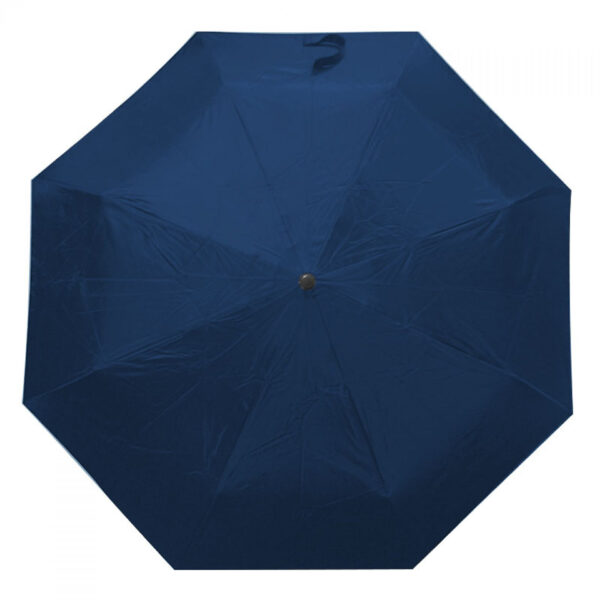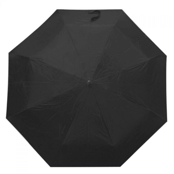 Poliéster pongee 190T de 21 pulgadas. Estructura metálica de color negro, mango en caucho y funda del mismo material.