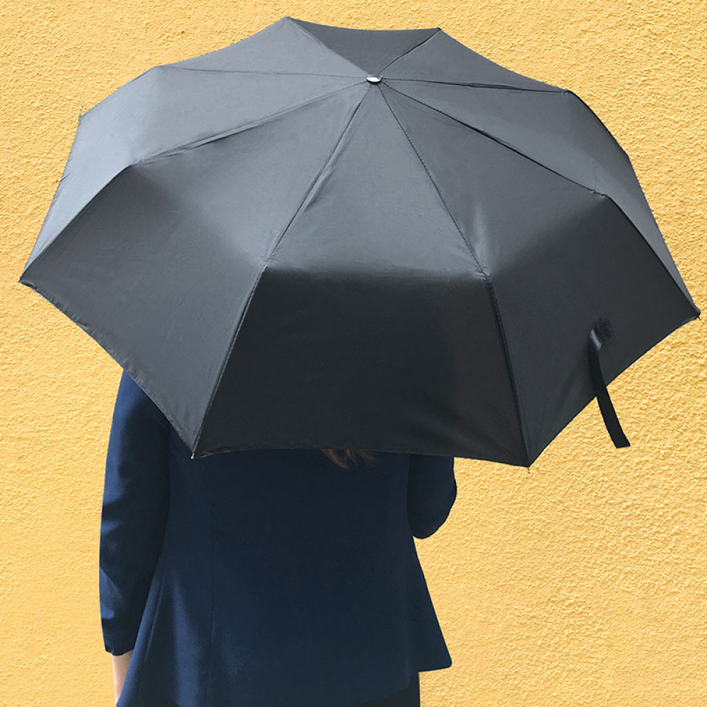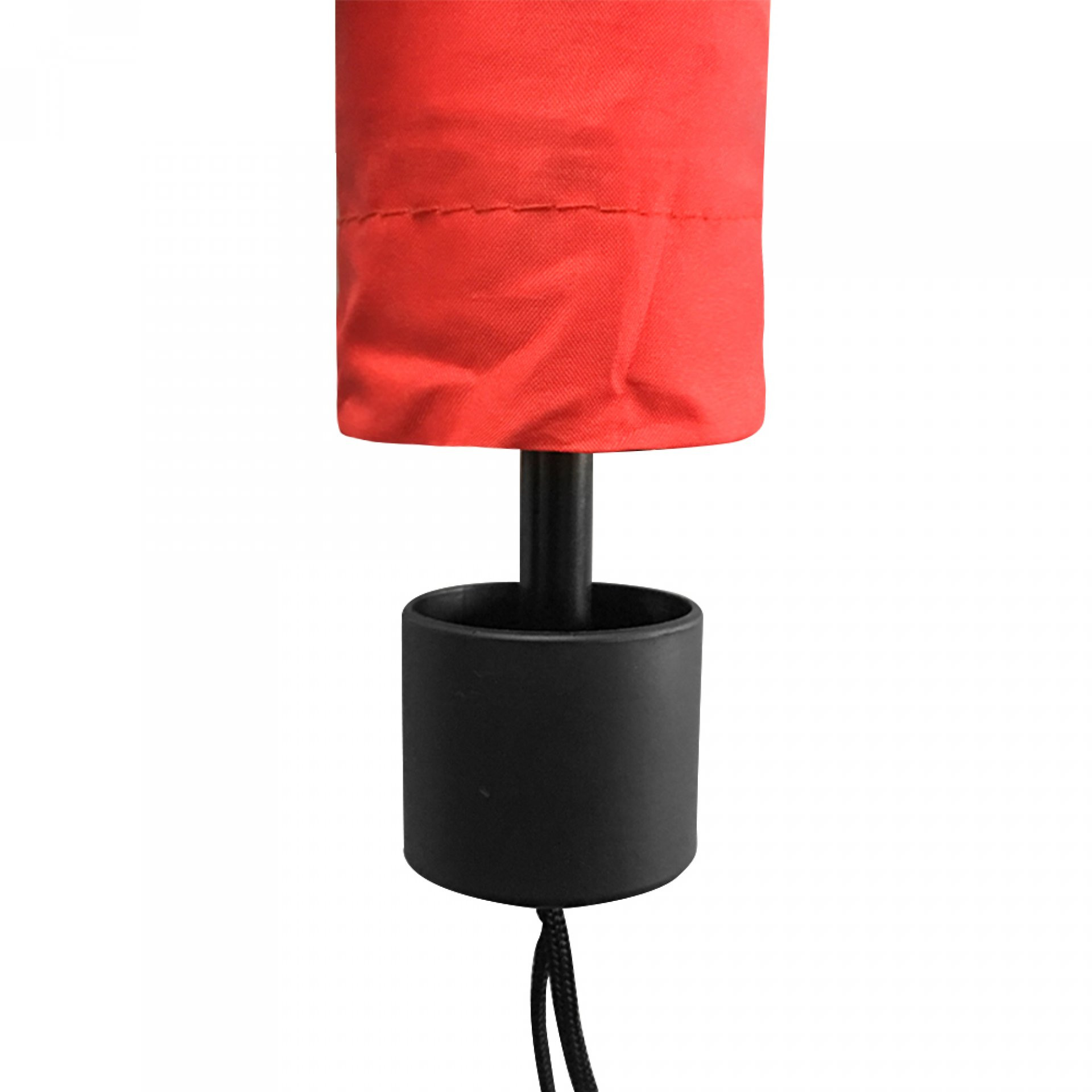Poliéster pongee 190T de 21 pulgadas. Estructura metálica de color negro, mango en caucho y funda del mismo material.