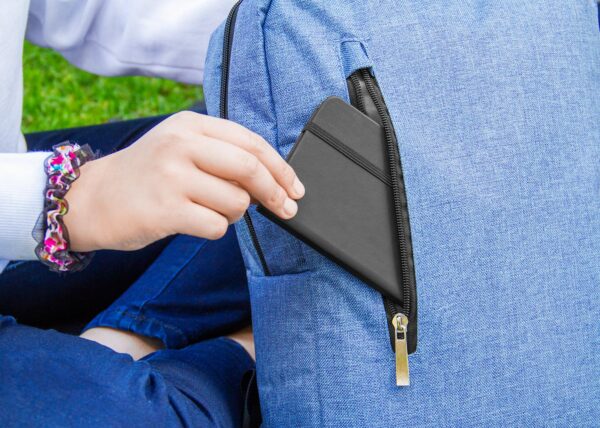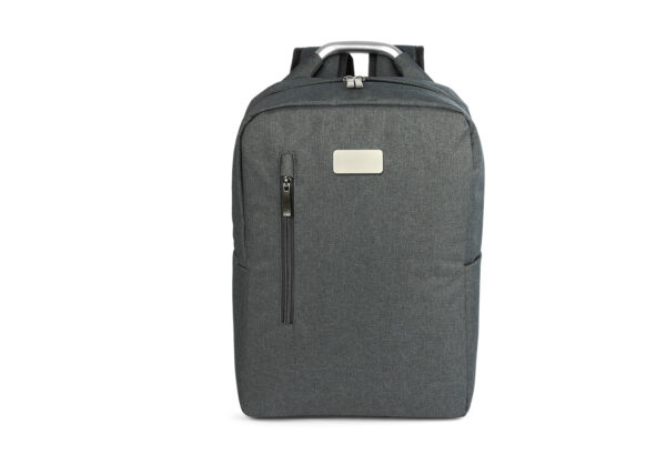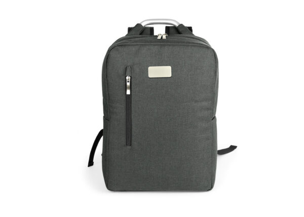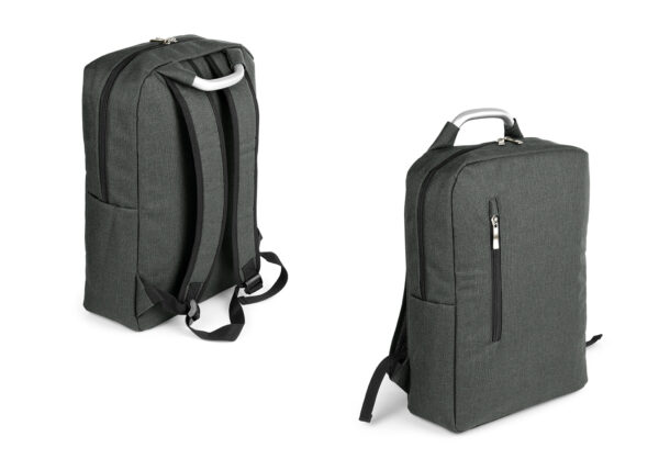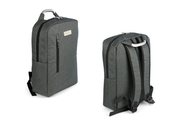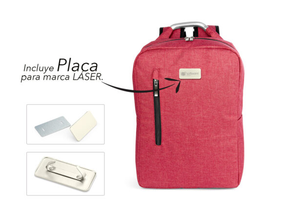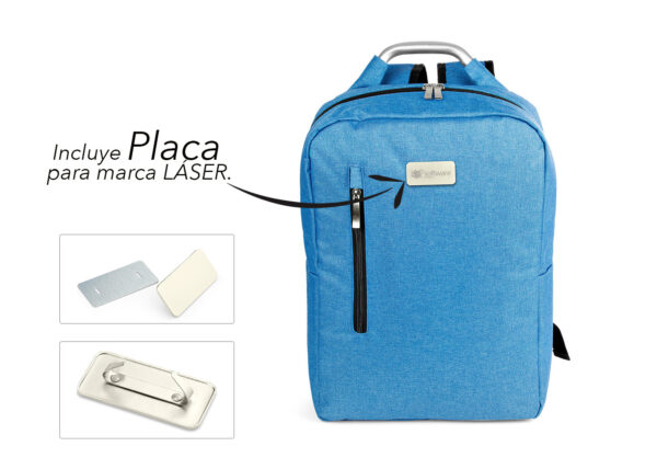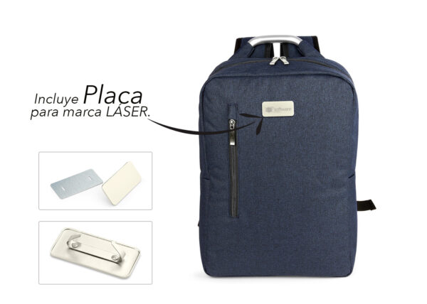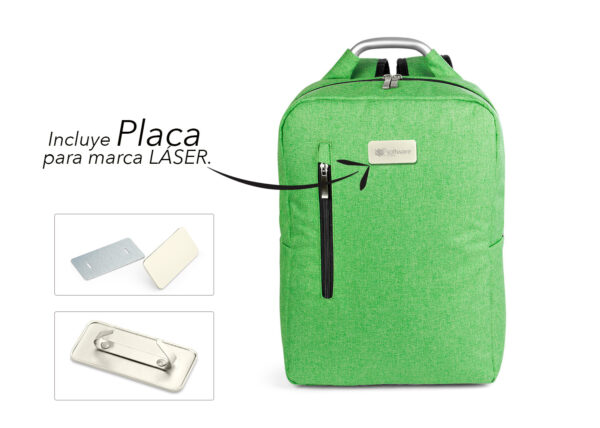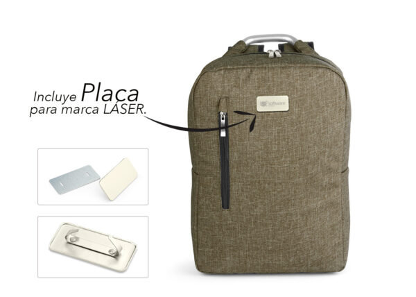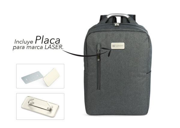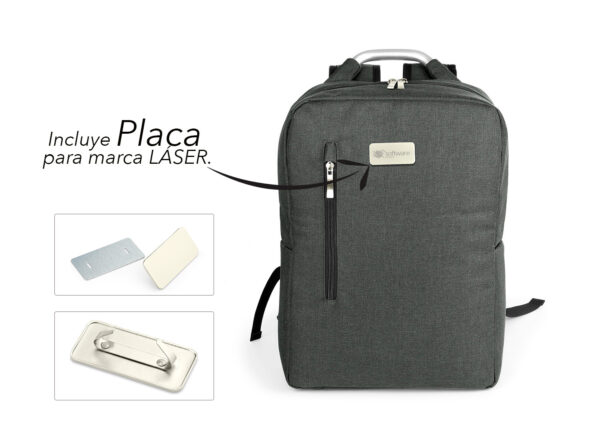 Morral con agarradera en Aluminio y cargaderas acolchadas, bolsillo principal con doble cremallera y compartimento con velcro para portátil de 14″, bolsillo interior para bolígrafo y libreta. Bolsillo frontal con cierre de cremallera. Incluye placa metálica para marca láser.