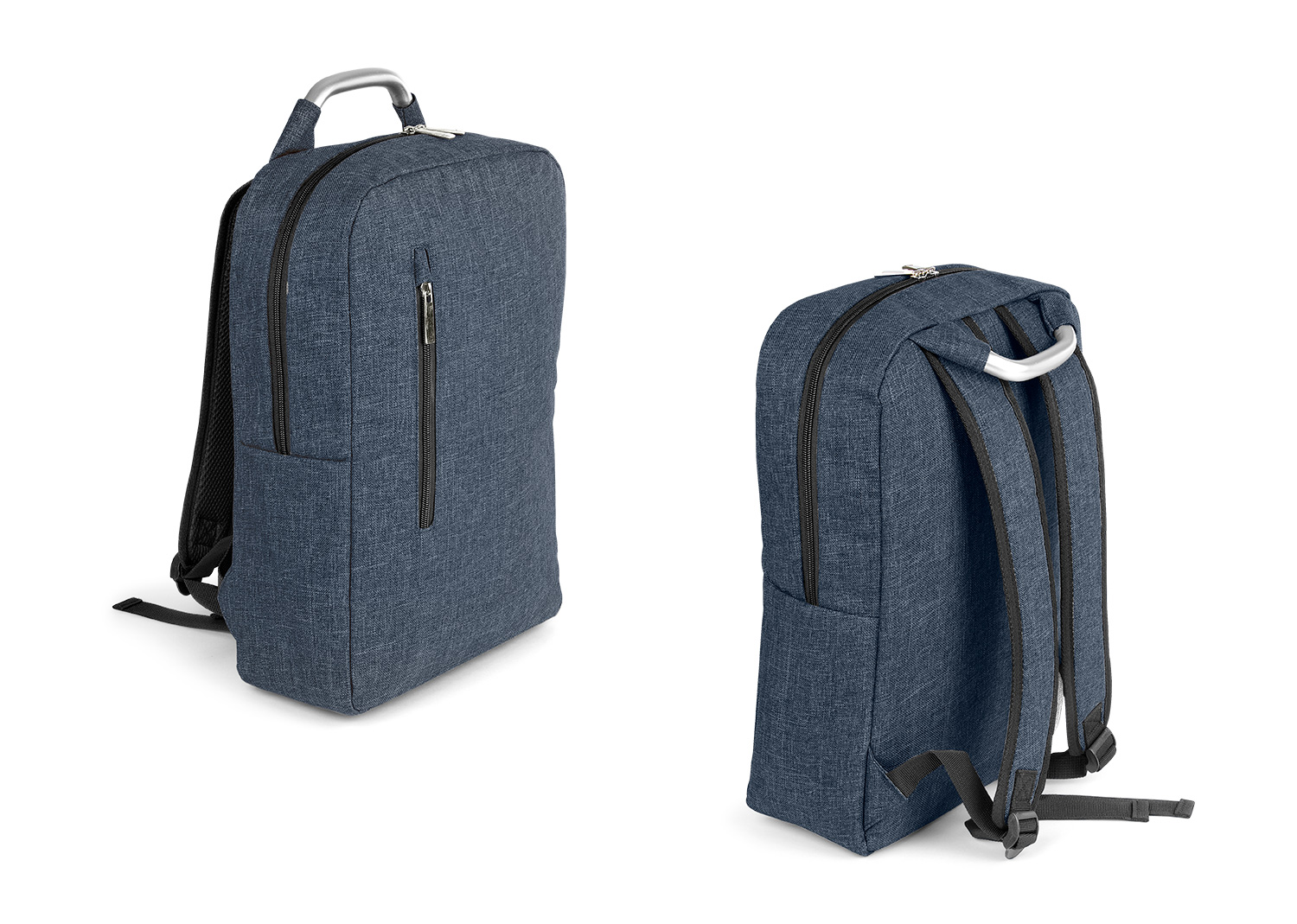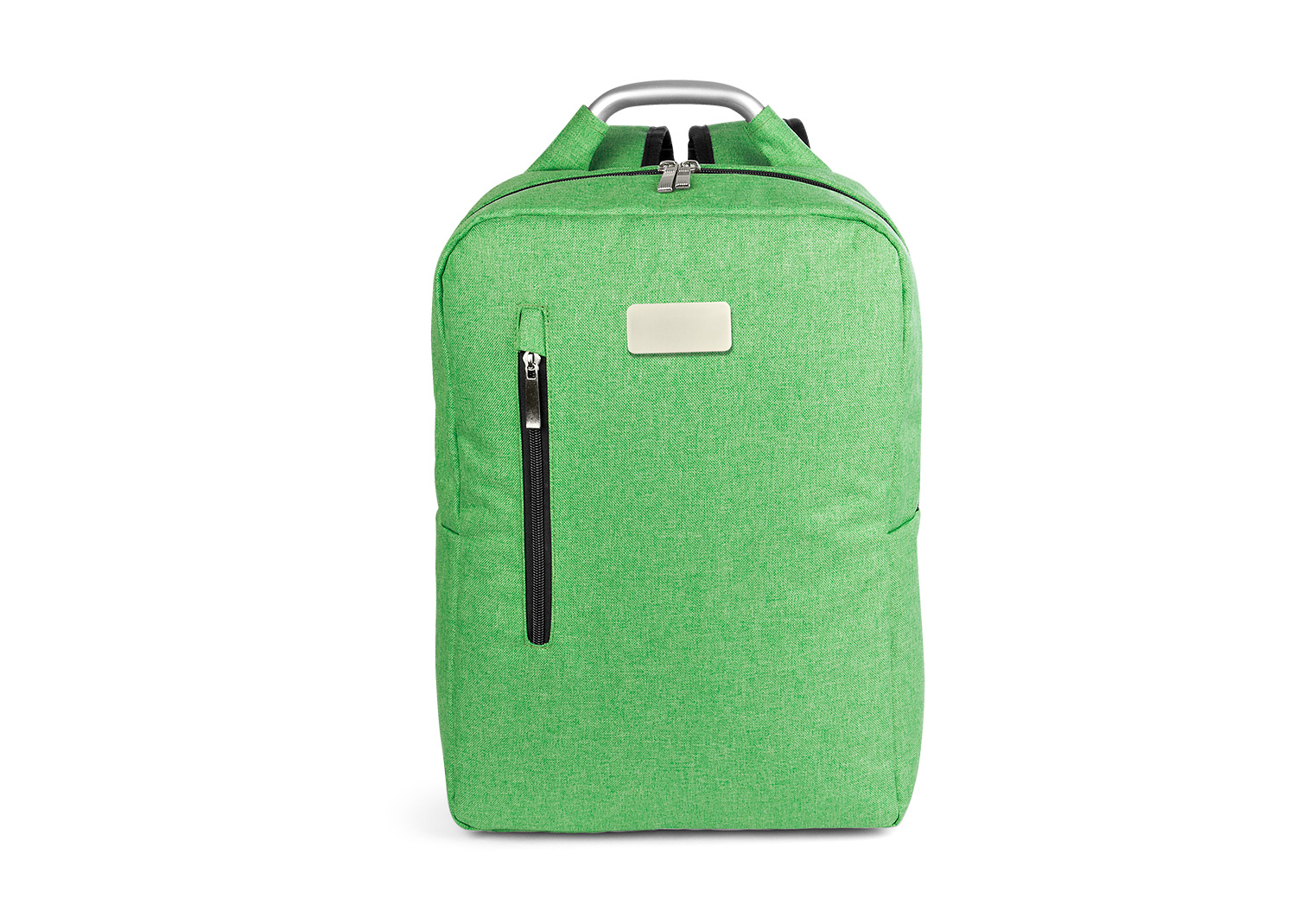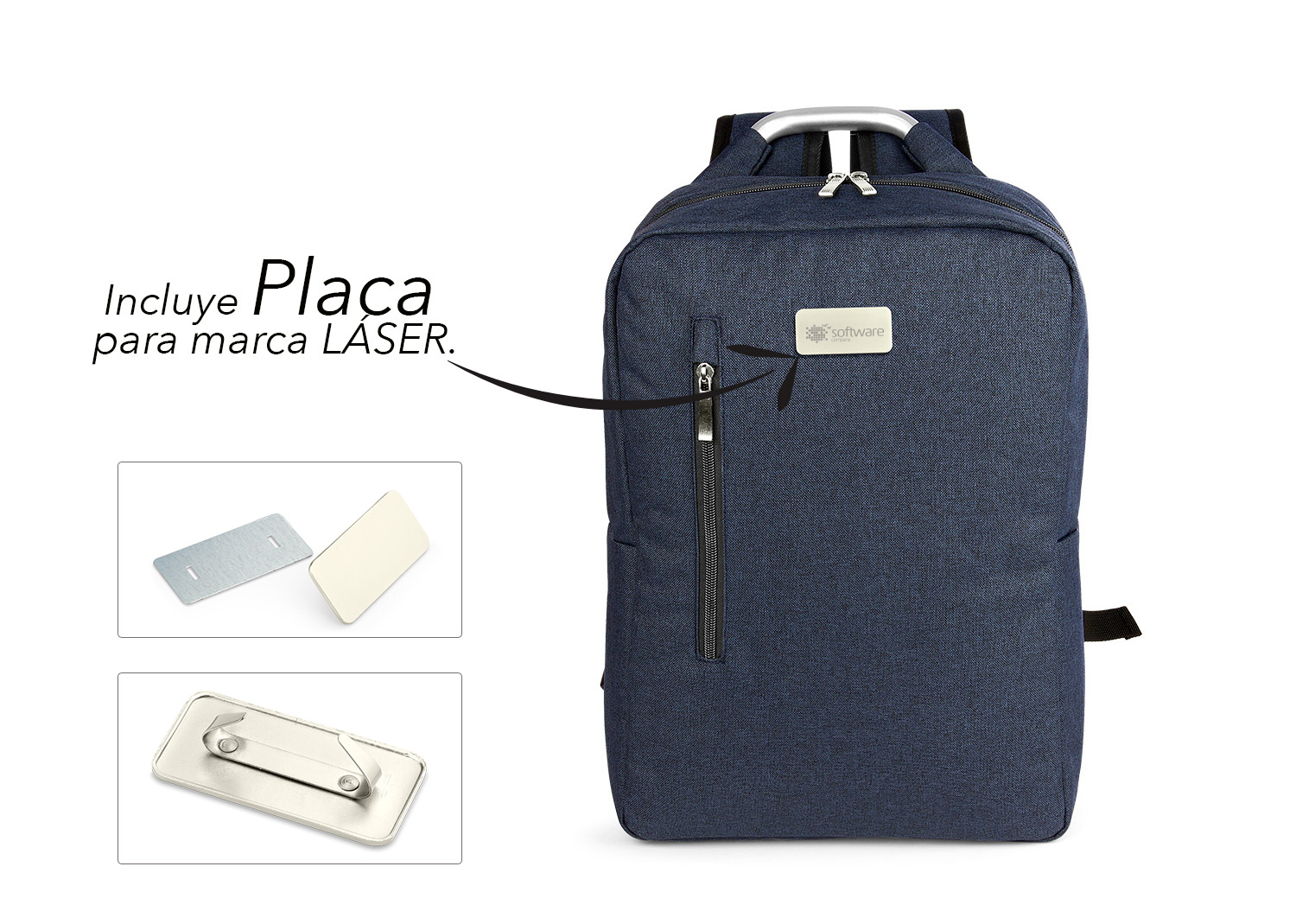 Morral con agarradera en Aluminio y cargaderas acolchadas, bolsillo principal con doble cremallera y compartimento con velcro para portátil de 14″, bolsillo interior para bolígrafo y libreta. Bolsillo frontal con cierre de cremallera. Incluye placa metálica para marca láser.