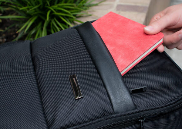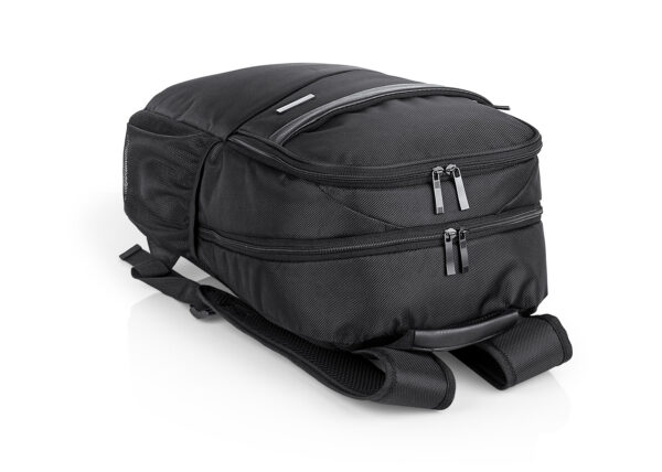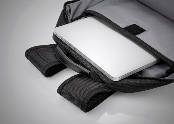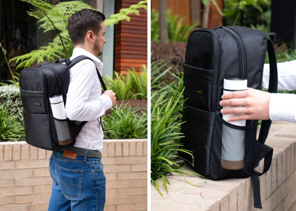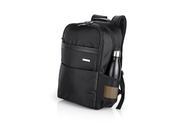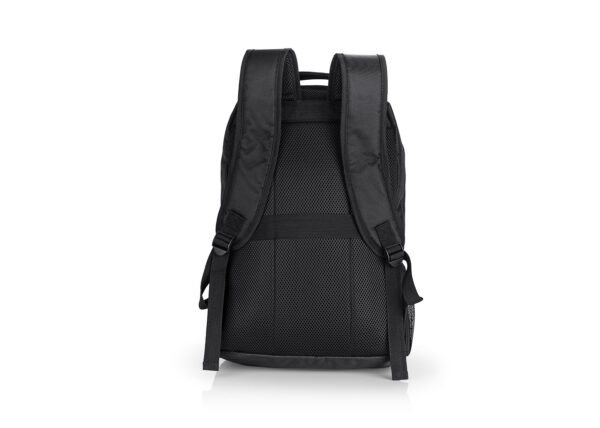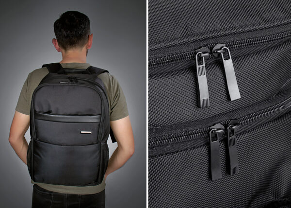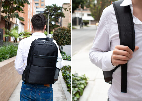 Morral Portalaptop con espaldar ergonomico, con cargaderas ajustables y acolchadas, 2 bolsillos exteriores, 1 bolsillo medio con compartimentos especiales en el interior, el bolsillo principal tiene un compartimiento para dispositivos portatiles de 15″, 2 bolsillos laterales en malla ideales para botellas y cables . correa en la parte trasera para ajustar el morral a un trolley, Incluye placa metálica para marca láser.