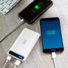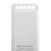 Batería auxiliar para smartphone con linterna LED y función de carga inalámbrica. Capacidad 8,000 mAh, con 4 LEDs indicadores de carga. Cuenta con 2 salidas USB, entrada micro USB y tipo C. Potencia de carga inalámbrica de 5W. Incluye cable cargador compatible con USB y micro USB.
