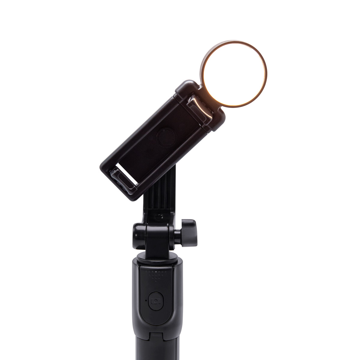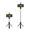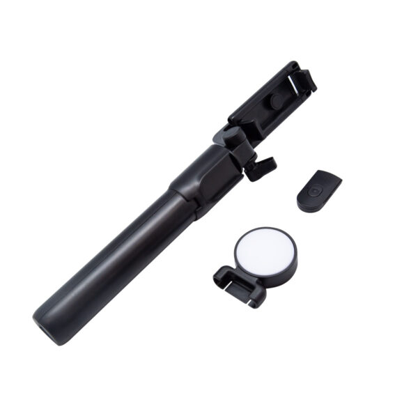 Selfie stick con tripie. Incluye control bluetooth para disparo de fotos vía remota (Batería de botón incluida). Conexión de hasta 10m de distancia. Incluye LED desmontable con luz fría, cálida y neutral. El holder gira 360° y el tubo retráctil alcanza hasta 68 cm. Incluye cable cargador con conexión micro USB para luz LED.
