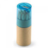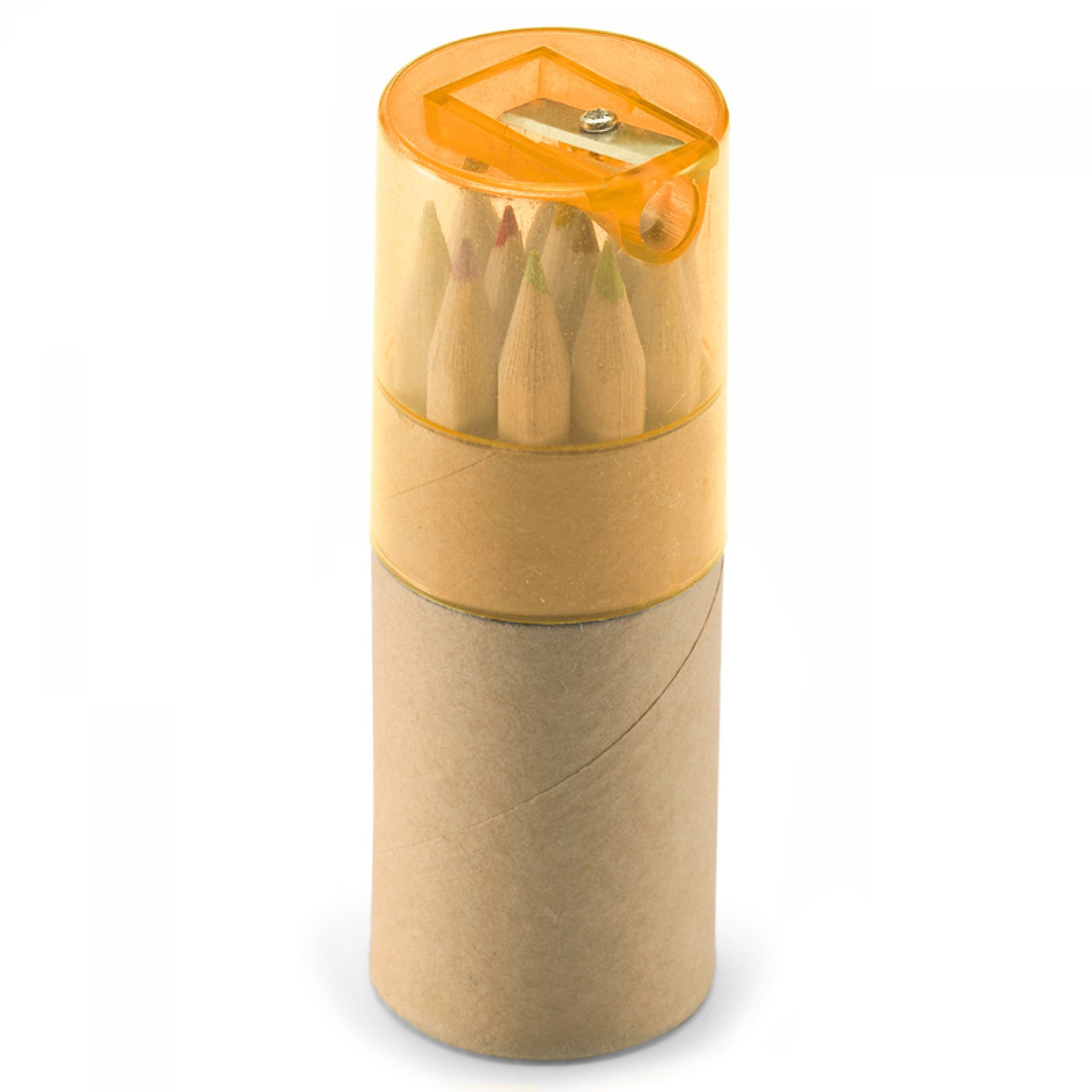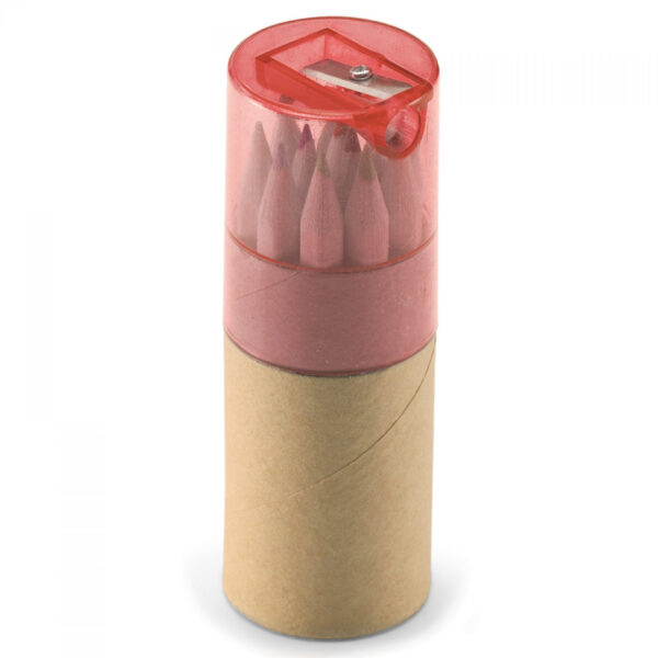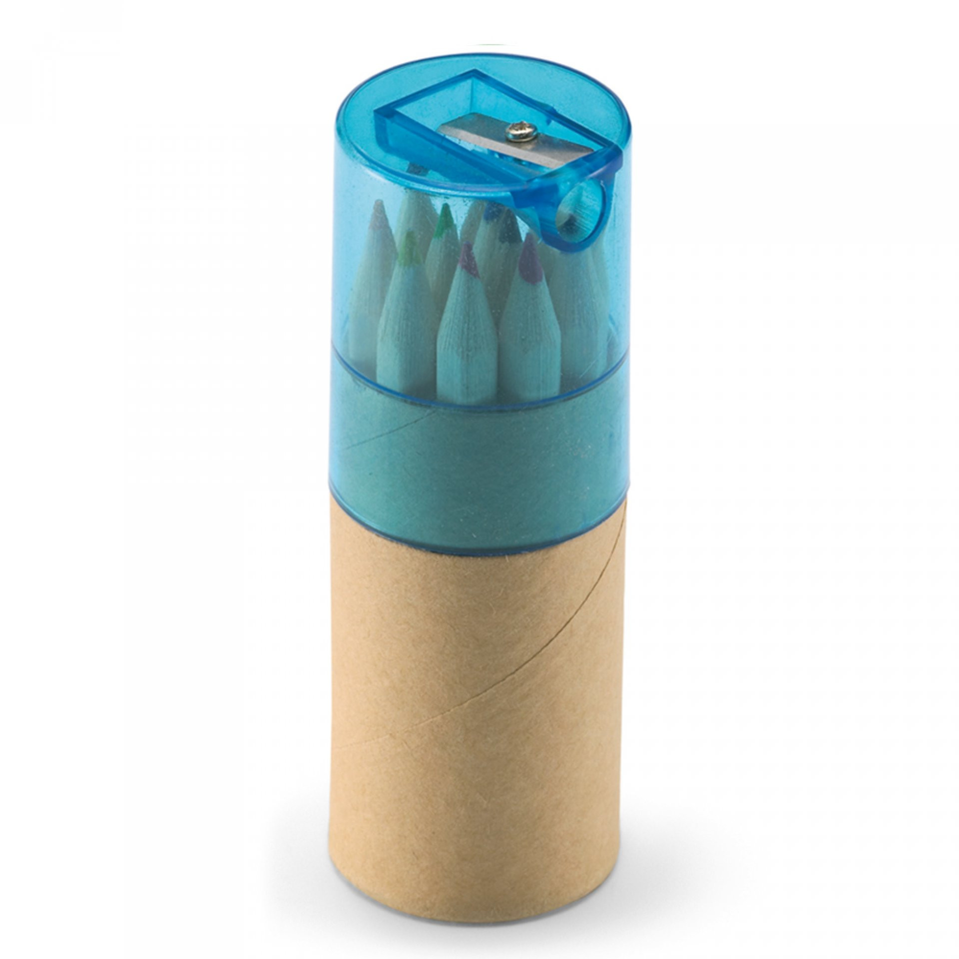 Tubo con 12 colores en cartón reciclable. Tapa traslúcida con taja lápiz. De 10,5 x 3,5 cm de diámetro.
