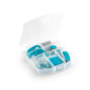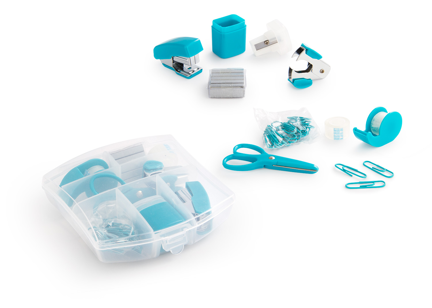 Práctico estuche plástico que contiene 1 una cosedora, ganchos de repuesto x 5, dispensador de cinta adhesiva, rollo de cinta adhesiva de repuesto, clips de colores, saca-ganchos, tijeras, taja-lápiz.