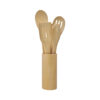 Set de bambú que incluye una base y 4 utensilios de cocina: cuchara, cuchara para ensalada, pala y pinzas.