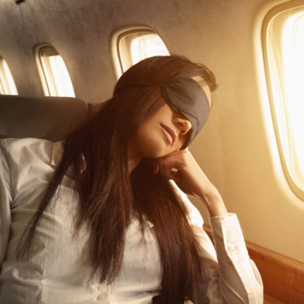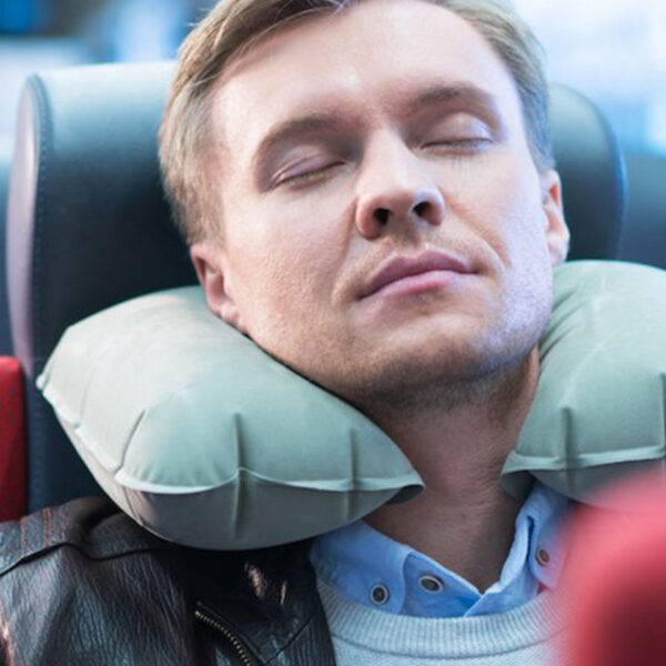 Cojín inflable gamuzado para el cuello con tapa ojos y bolsa ajustable en cambrel. De: 16,3 x 11 cm.