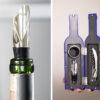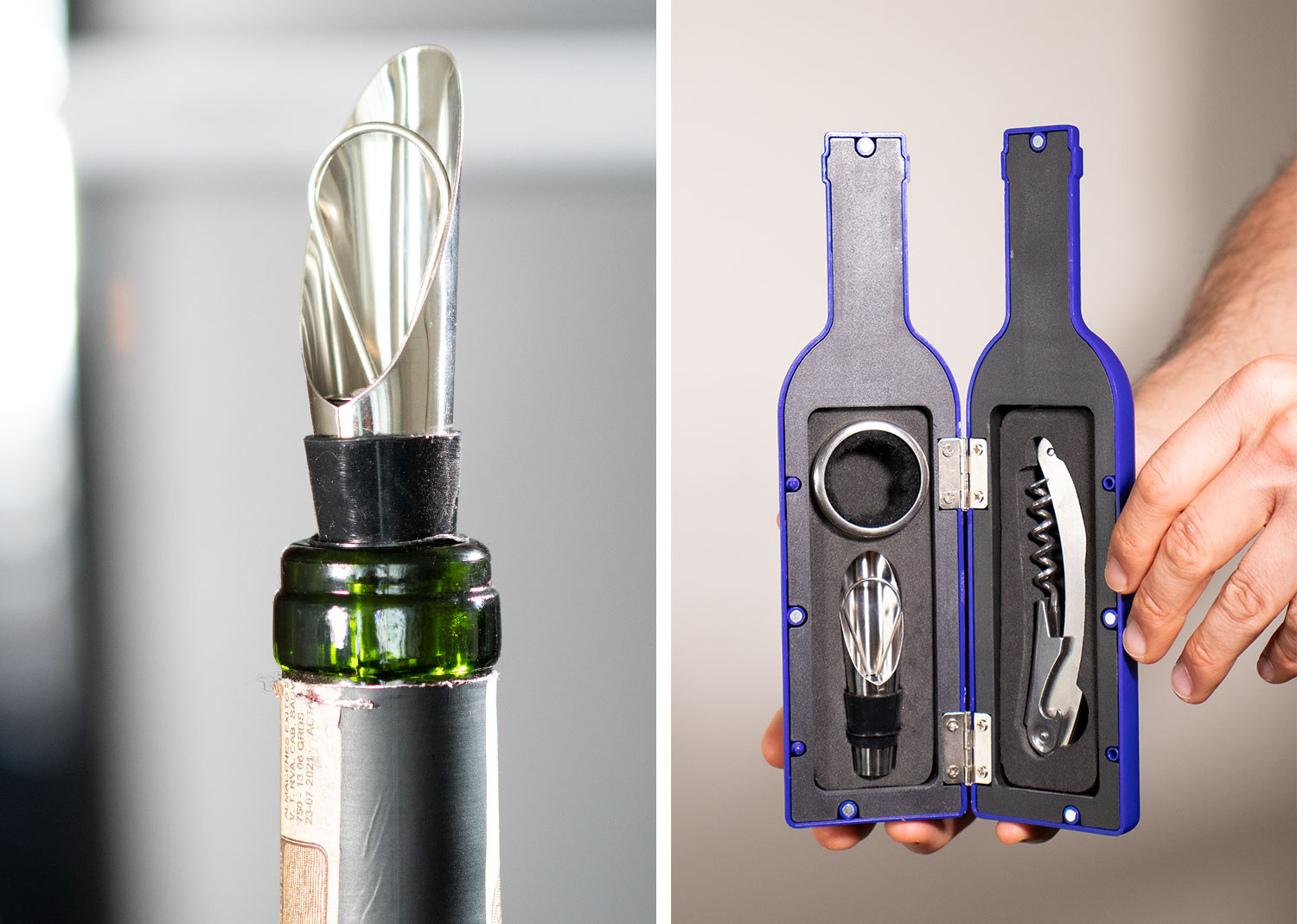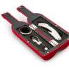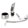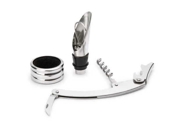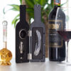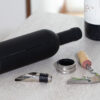 Contiene 3 accesorios de bar: Tapón para botella, aro anti goteo, sacacorchos de 1 tiempo. Caja con diseño de botella y acabado en goma.