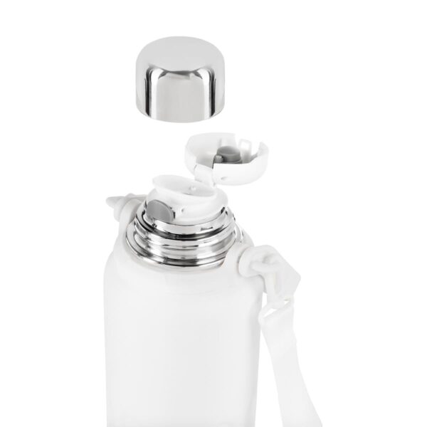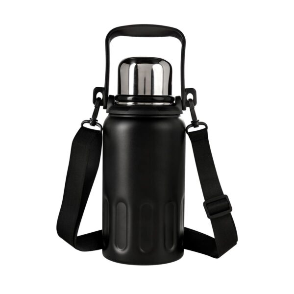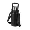 Termo doble pared. Cerrado al vacío. Pared interna y externa acero inoxidable y cuerpo con terminado tipo rugoso. Tapa de plástico con sistema de rosca, boquilla y botón de seguridad para mantener cerrado y sin derrames, incluye sobretapa metálica de rosca. Además, agrega un asa plegable de plástico y un asa de poliéster removible, que facilita su traslado. Mantiene la temperatura caliente por 10 hrs y la temperatura fría por 12 hrs. Capacidad de 40 Oz. Incluye caja individual.